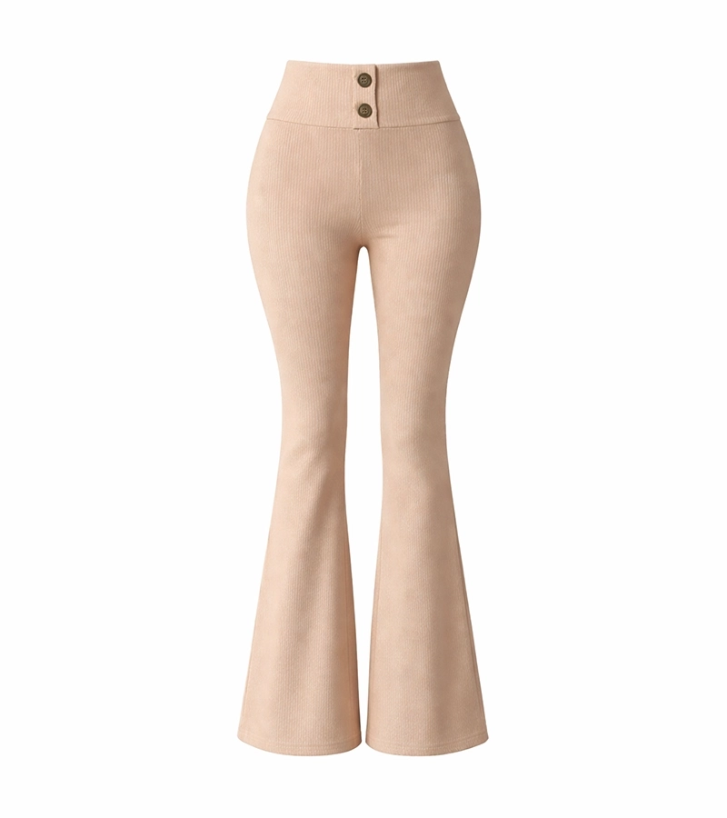 Beżowe legginsy prążkowane w fasonie flare z wysokim stanem i dwoma ozdobnymi guzikami. Elastyczna dzianina pięknie dopasowuje się do sylwetki, a szeroka nogawka od kolana optycznie wydłuża nogi. Uniwersalny model do eleganckich i codziennych stylizacji.