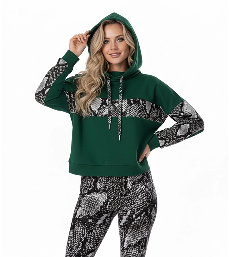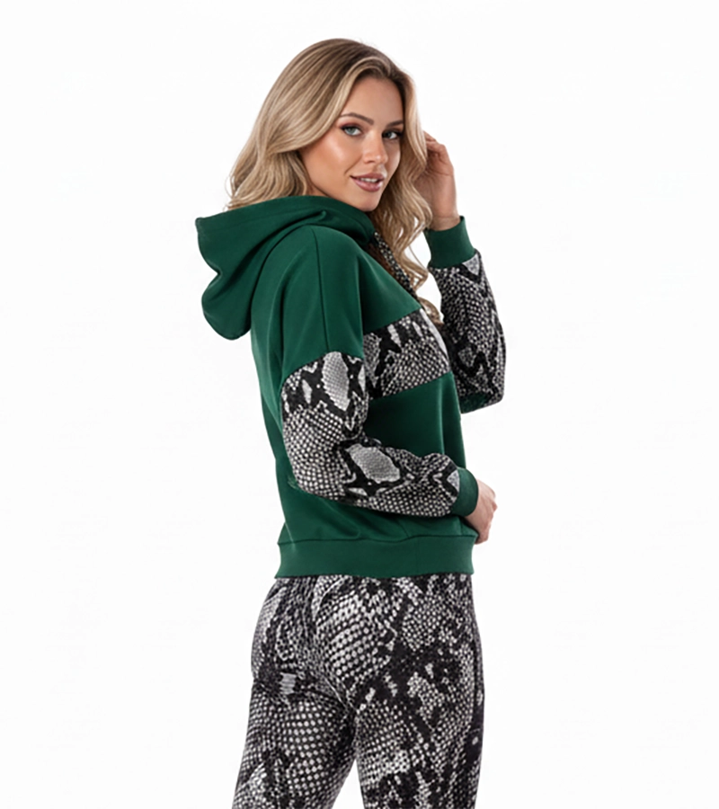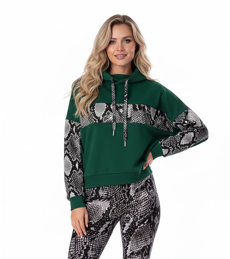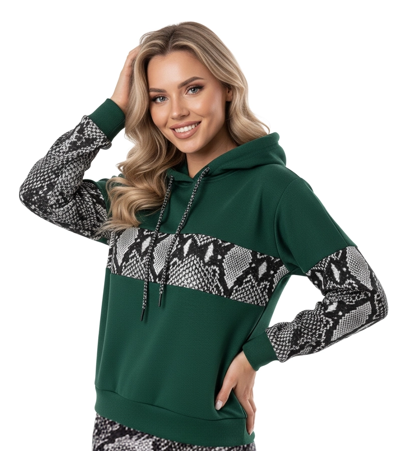 Ciepła bluza damska z kapturem butelkowa – wstawka w motyw skóra węża