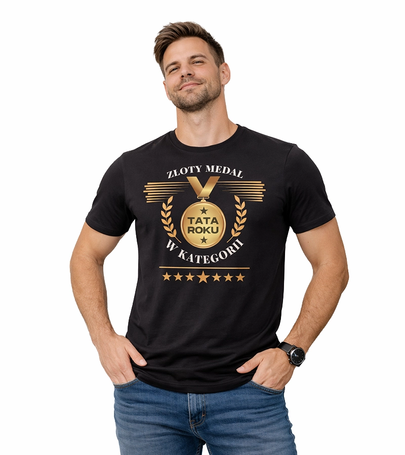 Wyjątkowa koszulka dla wyjątkowego faceta – tego, który codziennie daje z siebie 100% jako tata. Ten czarny T-shirt z nadrukiem „Złoty medal w kategorii Tata Roku” to idealny prezent dla każdego ojca, który zasługuje na uznanie (i stylowy look!).