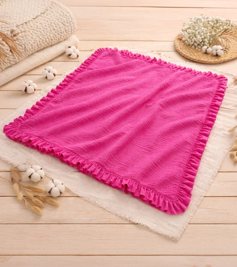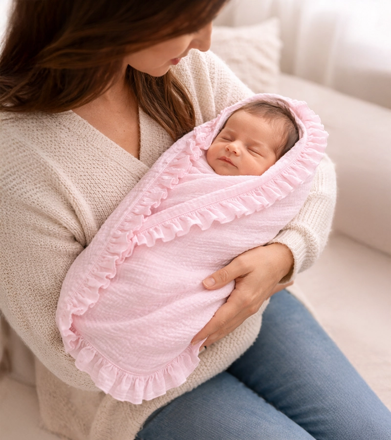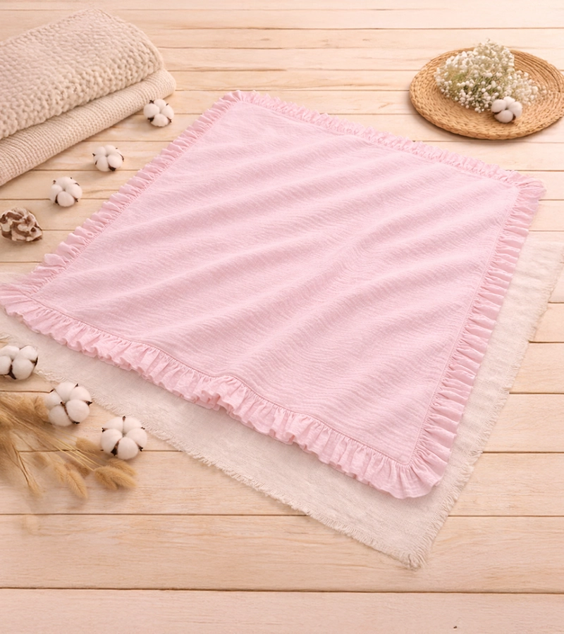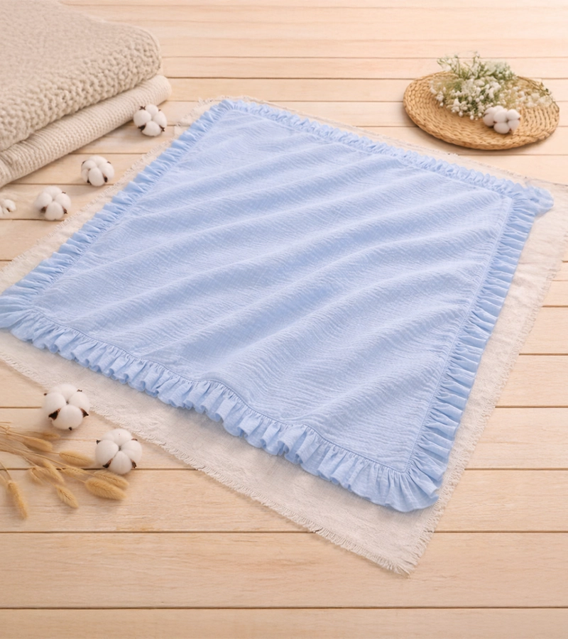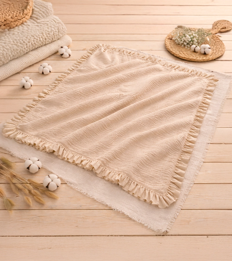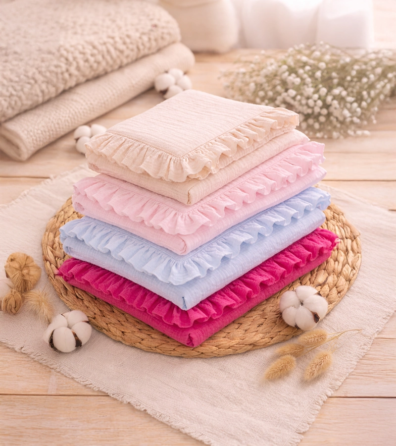 Otulacz muślinowy dla niemowląt 120×120 cm z falbanką – naturalna miękkość i komfort