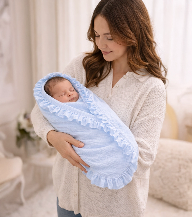 - Zastosowanie: otulanie maluszka, karmienie, drzemka, element wyprawki