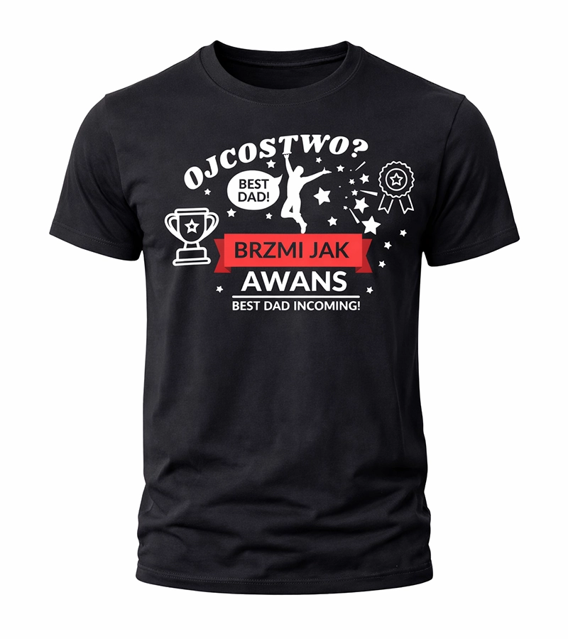- Nadruk: „Ojcostwo? Brzmi jak awans” z motywem pucharu, gwiazdek i napisu „Best Dad Incoming”